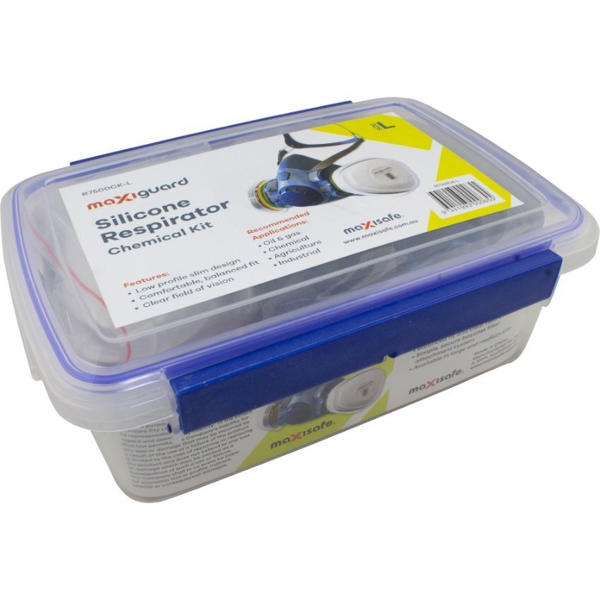 MaxiGuard Chemical Kit is the economical choice when you require respiratory protection from harmful fumes.ÿ Includes ABEK1P2 Cartridges. Conveniently packed in a resealable storage container, providing protection for the respirator and filters.ÿ The kit comes packaged in a Re-usable & Sealable container ready for use!